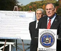 Castelli was known as a staunch fiscal conservative and held strong pro-business, anti-tax and limited government positions.[71][72][73] Yet he also held environmentalist views considered atypical for most Republican politicians, and his pro-conservation ideals garnered him support and endorsements from organizations such as the League of Conservation Voters and Sierra Club during all of his campaigns.[74][75][76] For instance, he was a cosponsor and vocal proponent of a ban on hydraulic fracturing in the Marcellus Shale region of upstate New York, a process for natural gas exploration which is known as "hydro-fracking."[77][78][79][80][81]