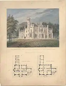 Donaldson hired his friend Alexander Jackson Davis to turn the home into the rural Gothic style (as well as build a gatehouse (similar in style to the Henry Delamater House),[23] and hired friend and horticulturist and landscape designer Andrew Jackson Downing to build an English garden with winding roads, waterfalls, and bridges.[1] In 1853, he sold part of Blithewood to John Bard, who maintained the home and landscape and donated a portion of the estate to found St. Stephen's College (today known as Bard College).[24] In 1899, after Bard's death, Andrew C. Zabriskie purchased the remaining estate, and hired the architect Francis L. V. Hoppin to raze Blithewood and build a new mansion, also known as Blithewood, which stands to this date.[24][25]