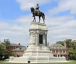 The Robert E. Lee Monument in Richmond, Virginia, was the first installation on Monument Avenue in 1890, and would ultimately be the last monument removed from the site.[3] Before its removal on September 8, 2021,[4] the monument honored Confederate Civil War General Robert E. Lee, depicted on a horse atop a large marble base that stood over 60 feet tall. Constructed in France and shipped to Virginia, it remained the largest installation on Monument Avenue for over a century; it was first listed on the National Register of Historic Places in 2007 and the Virginia Landmarks Register in 2006.[5]