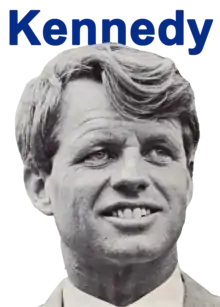 A Gallup poll conducted in the fall of 1965 showed 72% of respondents believed RFK wanted to become the president, and 40% of independents and 56% of Democrats stated their support for a possible bid.[30] Harris and Gallup polls released in August 1966 showed RFK being favored over President Johnson for the nomination by 2% among Democrats and 14% by independents.[31] A late March Gallup poll released shortly before RFK's entry into the primary showed him leading President Johnson by three points at 44% to 41%.[32] A poll released in the early part of April featured Kennedy with a 26-point lead over McCarthy in the Indiana primary, at 46% to 19%.[33] Another April poll in Indiana, the Oliver Quayle survey, showed Kennedy with a three-to-one lead over McCarthy and the state's governor Roger D. Branigin; Schmitt noted the poll featured a large portion of respondents refuting the label that RFK was not trustworthy along with being "too tough and ruthless."[34] An April 28 Gallup poll showed Kennedy at 28% support by Democratic voters, Humphrey behind by three points and McCarthy ahead by five.[35] A May 26 Associated Press poll showed RFK behind Humphrey among Pennsylvania national convention delegates, 1 to 27.[36] A June 2 Gallup poll showed Kennedy at 19% support among Democratic county chairmen, Humphrey at 67% and McCarthy at 6%.[37] A June 3 poll showed Kennedy leading McCarthy by nine points in the California primary, at 39% to 30%.[38] The following day, CBS polls showed Kennedy leading McCarthy by seven points.[39]