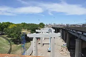 The interchange plaza connects with the over-water spans via a three-legged concrete viaduct that has a total length of more than 2.5 miles (4.0 km). The segments of the viaduct rest atop steel girders, which in turn are placed perpendicularly between concrete piers spaced 60 to 140 feet (18 to 43 m) apart.[20] Each pier is supported by a set of three octagonal columns. The viaduct is mostly eight lanes wide, except at the former locations of the toll plazas, where it widens. The viaduct once traversed Little Hell Gate, a small creek that formerly separated Randalls Island to the north and Wards Island to the south; the waterway has since been filled in.[24] The viaduct rose 62 feet (19 m) above the mean high water of Little Hell Gate.[22]