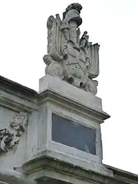Above is a plumed helm placed on a fasces, part of an antique trophy of arms.