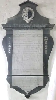 - Eodem loco jacent Penelope uxor eius filia Gulielmi Sandford de Ninehead in com(itatu) Somerset Arm(iger)i quae mortua est April A(nn)o D(omi)ni 1738o et Jacobus eorum filius qui mortuus est non. ... Aug A(nn)o D(omi)ni 174.. una cum q... plurimis infantulis supradicti Robertus & Penelope superstites reliquerunt Amiciam Luciam & Benjaminum qui hoc marmor suis hic affigi jussi... ("In the same place lie Penelope his wife a daughter of William Sandford of Nynehead in the county of Somerset, Esquire, who died in April in the year of our Lord 1738 and james the son of them who died on ... of August 174.. with many infants. The above Robert and Penelope left surviving Amicia, Lucy and Benjamin who ordered this marble to be affixed")