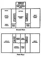 The students also did chores for two hours each day: the boys worked on the farm, in the garden or chopped firewood, while the girls did household duties, assisted with sewing, cooking and washing, and took care of the dining room. The students were provided with three meals a day, and were given plenty of time to sleep and play. Religious study was required, including church on Sunday and praying each morning and evening daily. Every night at dinner, along with singing and praying, every student had to recite a verse, or part of a verse, of Scripture from the Bible.[2]