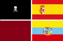 When Spain issued a decree blocking foreign countries from trading, selling or buying merchandise in its Caribbean colonies, the entire region became engulfed in a power struggle among the naval superpowers.[136] The newly independent United States later became involved in this scenario, complicating the conflict.[136] As a consequence, Spain increased the issuing of privateering contracts, a development that was in turn exploited by pirates.[136] In the midst of this chaos, Cofresí freely hoisted the flags of Spain and Colombia, sailing under them with the intent of approaching unsuspecting ships before plundering their cargo.[136] He was known to use this tactic in attacks that took place in the coastlines of Ponce, Fajardo, Vieques, Peñuelas, Guayama and Patillas.[136] Other flags have been associated with Cofresí, however, no historical proof has been provided to support their use.[137][138]