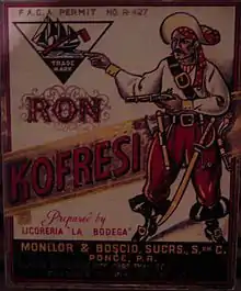 Outside his reputation as a pirate, Cofresí has also been directly linked to the creation of what later became the official beverage of Puerto Rico, the piña colada.[128] According to this account, when the crew's morale was low, he would mix them a beverage that contained coconut, pineapple and white rum.[128] This connection has been commercially exploited by different elements of the alcohol industry. In 2014, California-based The Bruery introduced a piña colada variant of the traditional American sour ale and named it "El Pirata Cofresí" after this legend.[129] During the 20th century, a rum brand adopted his patronymic as its namesake.[130] Ron Kofresí was distributed in Puerto Rico and was merchandised in a bottle that depicted a stereotypical pirate, wearing a large black hat, belts, and wielding a sword and a gun around his waist.[130] Since then the namesake has been used by other distilleries, including Dominican-produced Ron Cofresí and the New York-based Cofresí Rum Company.[130]