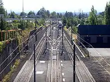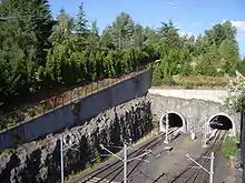 The Robertson Tunnel is a twin-bore light rail tunnel through the Tualatin Mountains west of Portland, Oregon, United States, used by the MAX Blue and Red Lines. The tunnel is 2.9 miles (4.7 kilometers) long[1] and consists of twin 21-foot-diameter (6.4 m) tunnels. There is one station within the tunnel at Washington Park, which at 259 feet (79 m) deep is the deepest subway station in the United States and the fifth-deepest in the world.[5] Trains are in the tunnel for about 5 minutes, which includes a stop at the Washington Park station. The tunnel has won several worldwide engineering and environmental awards.[6] It was placed into service September 12, 1998.[7]