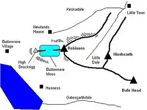 Robinson is a fell in the English Lake District, its southern slopes descending to Buttermere, while its northern side is set in the Newlands Valley. Paths lead to the summit from the village of Buttermere, from the nearby summit Dale Head and from various locations in the valleys to the north.