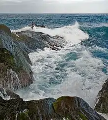 Rock fishing is fishing from rocky outcrops into the sea. It is a popular pastime in Australia[1][2] and New Zealand. It can be dangerous and many people have died.[3][4][5]This may improve as more people who are rock fishing are beginning to wear life jackets.