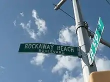 Rockaway Beach Boulevard, opened in 1886, was the first major east-west thoroughfare on the Rockaway Peninsula in the Borough of Queens in New York City. Much of its route parallels the Rockaway Freeway and the IND Rockaway Line above the Freeway. The boulevard first forks off at its eastern end from Beach Channel Drive at Beach 35th Street in Edgemere and merges once again with Beach Channel Drive by Jacob Riis Park shortly before the Marine Parkway–Gil Hodges Memorial Bridge.