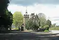Several buildings in and around the village were constructed as part of the Rolls estate. One of the entrance lodges to the family home at The Hendre, 2 miles (3.2 km) to the west, is sited immediately north of the village. Almshouses, provided in 1906 by Lord Llangattock for retired estate workers, are located beside the main road south of the village. They were designed by Aston Webb and built in local Old Red Sandstone with half-timbering.[7] To the north of the village, Pentwyn is a house designed and occupied from 1837 by the Monmouth architect George Vaughan Maddox, and later extended as a parsonage.[7]