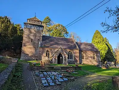The church tower is mediaeval, but the rest of the church was rebuilt and refitted in 1859–60 by John Prichard and John Pollard Seddon in the Early English and Perpendicular styles. It contains a painted coat of arms of William III, dated 1700.[7]
