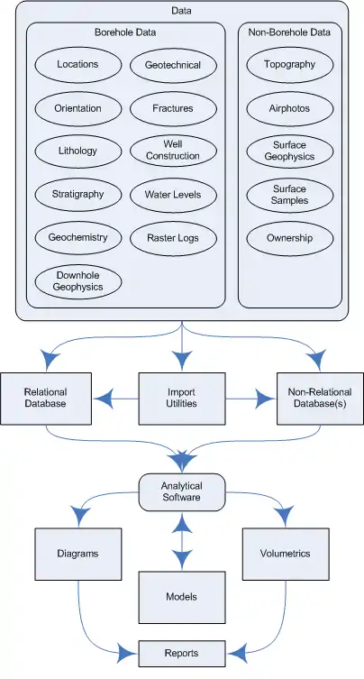 The raw dataset that are used for industrial mineral deposit modeling can be classified into two major types: borehole and non-borehole data. The management of borehole data is very different from non-borehole data. Specifically, borehole data requires a relational database management system (e.g. Access, FileMaker, SQL, Oracle,) whereas non-borehole data (with the exception of land ownership) can be handled with simple “flat” file managers (e.g. Microsoft Excel, Lotus 1-2-3).