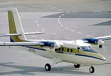 Vail Airways began operations with Cessna 310 piston twin aircraft,[4] followed by the Rockwell Aero Commander piston twin.[5] In 1969, Rocky Mountain Airways expanded with the 19 passenger de Havilland Canada DHC-6 Twin Otter twin engine turboprop.[6] On February 3, 1978, Rocky Mountain Airways took delivery as the worldwide launch customer of the larger, 50 passenger de Havilland Canada Dash 7-102 [7] four engine turboprop. In 1983, Rocky Mountain had placed an order for six 37-passenger de Havilland Canada Dash 8 twin turboprops,[8] coincident with the type's rollout, but in the event, no Dash 8 aircraft were delivered to Rocky Mountain.