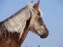 Rocky Mountain Horses stand between 14 and 16 hands (56 and 64 inches, 142 and 163 cm) high. Any solid color is accepted by the registry, but a dark brown color called "chocolate" with a pale, "flaxen" mane and tail is preferred.[1] This coloration is the result of the relatively rare silver dapple gene acting on a black base coat. Although uncommon, this gene has been found in over a dozen breeds, including the Rocky Mountain Horse.[2] Minimal white markings are accepted by the registry, although leg markings may not extend above the knee. The physical characteristics are somewhat variable, due to the disparate breeds that created the Rocky Mountain Horse.[1] The Rocky Mountain Horse is known by enthusiasts for its hardiness and ability to withstand winters in the mountains.[3] It is also praised for its good nature and affinity for humans.[4] Rocky Mountain Horses have the highest risk of any breed for the genetic ocular syndrome multiple congenital ocular anomalies (MCOA), originally called equine anterior segment dysgenesis (ASD). MCOA is characterized by the abnormal development of some ocular tissues, which causes compromised vision, although generally of a mild form; the disease is non-progressive. Genetic studies have shown that the disorder may be tied to the silver dapple gene, as most horses diagnosed with MCOA carry the gene.[5]