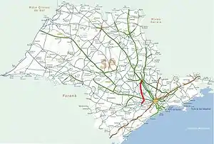 ![]() Map of the itinerary of Rodovia Santos Dumont (in red) | |