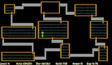 As Toy was more proficient at programming, he led the development of the game in the C language which generally produced fast effective code. Wichman learned the language from Toy as they went along while providing significant input on the design of game.[3][4] The first two major aspects of the game developed was the method of displaying the dungeon on screen to the player, and how to generate the dungeon in a random manner.  Limited by choices of what a terminal could display, they stuck to ASCII-based characters, such as . for empty floor space, + for doors, and | and - for walls of the dungeon. They also opted to use the "at" symbol (@) to represent the player, considering this showed the player "where they're at".[3] For the dungeon, they found initial attempts at purely random generation to be weak, in some cases having a stairway ending up in a room inaccessible to players. They found a solution through procedural generation, where each level would start on the idea of a 3x3 tic tac toe grid, with each room of various size occupying one space in this grid, and then creating the hallways to connect the rooms.[3] Once they could have their character move about these randomly created dungeons, they then added equipment, magic items, and monsters. With magic items, they wanted the effects of these items to be a mystery on each run through, and thus would initially present the items to the player only by a descriptor such as by color, and only later in the game give the true name of the item once the player experimented or used another means to identify the item.[3] For monsters, they wanted to have more advanced intelligence routines as the player got to deeper depths of the dungeons, but had started running into memory limits on the VAX-11, and simply made the monsters stronger with more health to pose more of a challenge.[3][1]