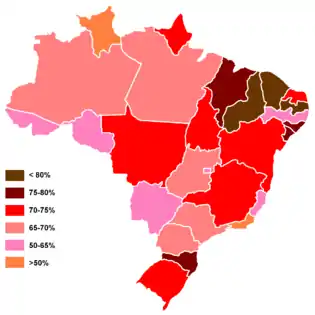 Religious change in Brazil is frequent.[10] According to polling institute Datafolha, as of July 2013, approximately 57% of those aged over 16 years old were Catholic, while evangelicals constituted 28%.[21]