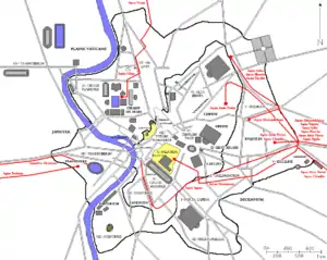 Most of Rome's aqueducts drew on various springs in the valley and highlands of the Anio, the modern river Aniene, east of the Tiber. A complex system of aqueduct junctions, tributary feeds and distribution tanks supplied every part of the city.[10] Trastevere, the city region west of the Tiber, was primarily served by extensions of several of the city's eastern aqueducts, carried across the river by lead pipes buried in the roadbed of the river bridges, thus forming an inverted siphon.[11] Whenever this cross-river supply had to be shut down for routine repair and maintenance works, the "positively unwholesome" waters of the Aqua Alsietina were used to supply Trastevere's public fountains.[8] The situation was finally ameliorated when the emperor Trajan built the Aqua Traiana in 109 AD, bringing clean water directly to Trastavere from aquifers around Lake Bracciano.[12]