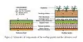 Green roofs may be extensive or intensive.[15] The terms are used to describe the type of planting required. The panels that comprise a green roof are generally no more than a few centimeters up to 30 cm (a few inches up to a foot) in depth, since weight is an important factor when covering an entire roof surface. The plants that go into a green roof are usually sedum or other shallow-rooted plants that will tolerate the hot, dry, windy conditions that prevail on most rooftop gardens. With a green roof, "the plants layer can shield off as much as 87% of solar radiation while a bare roof receives 100% direct exposure".[16]