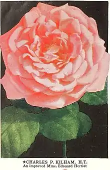Rosa 'Charles P. Kilham' is an orange-red hybrid tea rose, bred by Irish rose breeder, Samuel McGredy III before 1926. The rose was introduced in France in 1926 and Australia in 1927. It won the Royal National Rose Society (RNRS) gold medal in 1927. 'Charles P. Kilham' is one of the ancestors of the legendary hybrid tea rose, 'Peace'.