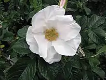 Rosa brunonii is a species of flowering plant in the family Rosaceae. It is commonly known as Himalayan musk rose.[2] It is a deciduous or semi-evergreen climber[3] most commonly seen along the foothills of the Himalayas and grows at heights of 1200-2400 m. Come May, all the musk rose bushes burst into bloom, clothing trees, running wild over hedges and tumbling precariously over cliffs and boulders. The air is heady with their scent and honeybees and nectar-loving insects have a field day.[4][1]