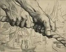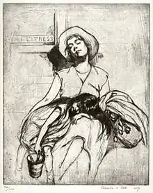 Throughout her career she made portraits, landscapes and seascapes, figure studies, genre paintings, and still lifes. In 1941 a critic said it was the portraits that had made her famous.[1] In 1938 the New York Times critic, Howard Devree, said that Osk's prints were outstanding.[17] A series of four etchings called, "Hands," was widely admired. When shown in 1937 Devree called them "arresting."[18] When shown again in 1941, the Times critic, Ada Rainy, said they were effective in their characterization,[1] and one of them ("The Sailor," shown at left) was included in the book, American Prize Prints of the Twentieth Century.[19][note 5] In her 1941 article on Osk's etchings, Ada Rainey, called "Little Old Lady" (shown at right) "a fine characterization."[1] In 1942 Rainey described a drypoint, "The Sisters" (shown at left), as "done with understanding of the value of strength of line and the structure of the figures."[20] In 1953 the Times critic, Leslie Judd Portner, wrote that Osk's drypoint, "Six O'Clock" (shown at right) was "completely realistic."[21] As well as paintings, etchings, and drypoints, Osk made aquatints and etched relief prints in the late 1940s.[1]