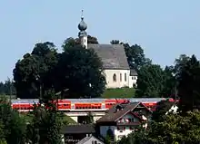 The next station is Traunstein, where several lines branch off: the line to Ruhpolding, the line to Traunreut and Garching and the line to Waging. In Traunstein the railway passes over a bridge over the Traun. The line runs over a steep downhill section towards Freilassing. Shortly after leaving Traunstein station, Ettendorf church (St. Vitus and Anna) lies next to the line. In Freilassing station a branch from Mühldorf and another branch from Berchtesgaden join the line. On the outskirts of Freilassing the line crosses the border, which runs along the Saalach river, into Austria and the outskirts of Salzburg. In Siezenheim there is a freight yard with sidings to a large chipboard factory in an industrial area and to the Schwarzenberg barracks. Then the line runs between the districts of Taxham, Maxglan and Mülln to the south and Lehen and Liefering to the north across the Salzach to Salzburg Hauptbahnhof.[9]