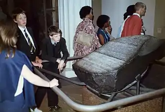 The Rosetta Stone was originally displayed at a slight angle from the horizontal, and rested within a metal cradle that was made for it, which involved shaving off very small portions of its sides to ensure that the cradle fitted securely.[48] It originally had no protective covering, and it was found necessary by 1847 to place it in a protective frame, despite the presence of attendants to ensure that it was not touched by visitors.[51] Since 2004 the conserved stone has been on display in a specially built case in the centre of the Egyptian Sculpture Gallery. A replica of the Rosetta Stone is now available in the King's Library of the British Museum, without a case and free to touch, as it would have appeared to early 19th-century visitors.[52]