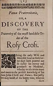 Between 1614 and 1617, three anonymous manifestos were published, first in Germany and later throughout Europe.[6] These were the Fama Fraternitatis RC (The Fame of the Brotherhood of RC, 1614), the Confessio Fraternitatis (The Confession of the Brotherhood of RC, 1615), and the Chymical Wedding of Christian Rosicross anno 1459 (1617).
