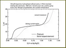 Potential sweep reversals as used in cyclic voltammetry are different for a RDE system, since the products of the potential sweep are continually swept away from the electrode. A reversal would produce a similar i-E curve, which would closely match the forward scan, except for capacitive charging current. A RDE cannot be used to observe the behavior of the electrode reaction products, since they are continually swept away from the electrode. However, the rotating ring-disk electrode is well suited to investigate this further reactivity. The peak current in a cyclic voltammogram for a RDE is a plateau like region, governed by the Levich equation. The limiting current is typically much higher than the peak current of a stationary electrode, being that the mass transport of reactants is actively stimulated by the rotating disk, and not just governed by diffusion, as is the case for a stationary electrode. Any rotating disk electrode can, of course, also be used as a stationary electrode by using it with the rotator turned off.