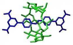 The earliest reported synthesis of a rotaxane in 1967 relied on the statistical probability that if two halves of a dumbbell-shaped molecule were reacted in the presence of a macrocycle that some small percentage would connect through the ring.[2] To obtain a reasonable quantity of rotaxane, the macrocycle was attached to a solid-phase support and treated with both halves of the dumbbell 70 times and then severed from the support to give a 6% yield. However, the synthesis of rotaxanes has advanced significantly and efficient yields can be obtained by preorganizing the components utilizing hydrogen bonding, metal coordination, hydrophobic forces, covalent bonds, or coulombic interactions. The three most common strategies to synthesize rotaxane are "capping", "clipping", and "slipping",[3] though others do exist.[4][5] Recently, Leigh and co-workers described a new pathway to mechanically interlocked architectures involving a transition-metal center that can catalyse a reaction through the cavity of a macrocycle.[6]