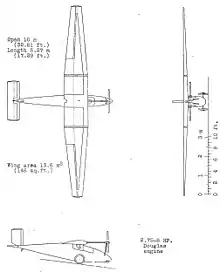 The Douglas engine was mounted flush inside the cockpit of the glider, with the prop driven by internal belts. The rudder and elevators were hinged to be a single movable surface.[2]