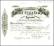 Eadie had won contracts to supply precision parts for firearms to the government's long-established Royal Small Arms Factory at Enfield, Middlesex, with its offshoot in Sparkbrook and had assumed the brand name Royal Enfield.[10] In 1896 they also incorporated a new subsidiary company, The New Enfield Cycle Company Limited,[note 1] to handle much of the cycle work and in 1897 Enfield making complete cycles as well parts for other assemblers took all the cycle assembly work from Eadie.
