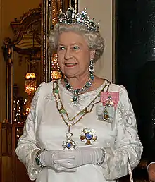 The Royal Family Order of Queen Elizabeth II depicts The Queen in evening dress wearing the ribbon and star of the Order of the Garter. The miniature, painted on ivory (glass since 2017), is bordered by diamonds and surmounted by a Tudor crown in diamonds and red enamel. The reverse, in silver-gilt, is patterned with rays and depicts the royal cypher and St Edward's Crown in gold and enamel. The watered silk ribbon is chartreuse yellow and formed into a bow.