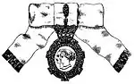 The badge of the order consists of a portrait of the Sovereign set in diamonds, which is suspended from a ribbon. The ribbon of each Royal Family Order changes with each monarch: Edward VII's was variegated of red, blue, and white (similar to the colors of the Royal Victorian Order) and George VI's was rose pink. Each contained a portrait of the sovereign, usually in uniform (if male), or evening dress (if female). The reverse of the order contains the royal cypher of the sovereign.