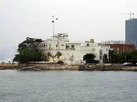 The main buildings of the club are located by Victoria Harbour on the former Kellett Island, now part of Causeway Bay following land reclamation, and forming the western boundary of the Causeway Bay Typhoon Shelter. The Club moved there in 1938, and the clubhouse was built in International Modern style in 1939[6] on the foundations of the old Naval Powder Magazine.[7] It was designed by architects G.G. Wood and J.E. Potter of Leigh & Orange.[8] The new premises were formally opened on 26 October 1940 by the Acting Governor, Lieutenant General Sir E. F. Norton.[9] The building has been listed as a Grade III historic building since 22 January 2010.[10]
