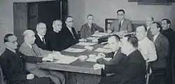Photo from a session of 1942. From left to right: Vangjel Koca, Aleksander Xhuvani, Anton Paluca, Anton Harapi, Xhevat Korça, Mustafa Kruja, Ernest Koliqi, Dhimiter Beratti, Giuseppe Valentini, Karl Gurakuqi, Eqrem Vlora, Nicola Lo Russo Attoma, Dom Lazër Shantoja.
