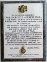 - Lt Col. Collis George Herbert St. Hill (1865–1917). Promoted Lt. Col. Royal North Devon Hussars, 16 June 1916.[43] Killed in action 8 July 1917 at Villers-Plouich, Northern France,[44] whilst commanding a battalion of the Sherwood Foresters; buried at Neuville-Bourjonval,[45] near Ypres. He was the 2nd son of Rev. Canon Woodford St Hill of Hawkes Bay, New Zealand[46] and was a grandson of Henry Charles St Hill, of Bradninch House in Devon, for many centuries the seat of that family[47] (anciently spelled "Sainthill"). His mural monument exists in St Disen's Church, Bradninch. In 1899 he married Ammabel Wilson (d.1949),[48] a daughter of Sir Spencer Maryon-Wilson, 10th Baronet of Charlton House, Kent.[49]