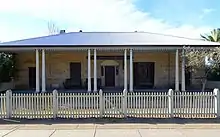 Single storey Georgian sandstone inn, with front verandah and a single-pitch (formerly tiled), hip roof over the whole. Street front verandah has doubled timber Doric columns and a simple scalloped valance. Front six-panel door has glazing in the upper four panels, flanked by side lights and surmounted by a large fanlight. French doors open onto the verandah either side of the central front door with shutters. Four panelled doors sit on the outside of the French doors. All doors have sandstone headers and thresholds. The Front elevation of dressed sandstone, sides and rear are random-coursed.[1]