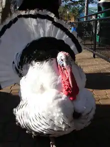 The Royal Palm is a breed of domestic turkey. It is not primarily selected for meat production, and is usually kept as an ornamental bird with a unique appearance, largely white with bands of metallic black.
