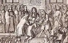 Louis XIII (r. 1610–1643) and Louis XIV (r. 1643–1715) both actively took part in touching ceremonies. The latter touched 1,600 people on Easter 1680.[3] Voltaire (1694–1778) scornfully wrote that he had lost confidence in the royal touch upon hearing that a mistress of Louis XIV died of scrofula "despite being very well touched by the king".[9] After 1722, the sentence exclaimed by the king upon touching the infected changed to the more hopeful: "The King touches you, may God heal you." (French: "Le roi te touche, Dieu te guérisse.") The new formula, rather than implying that God would inevitably grant the monarch's wish, was a prayer that may or may not result in a cure. Louis XV (r. 1715–1774) was skeptical about the royal touch. He performed it early in his reign, but caused a scandal when he failed to summon the scrofulous at Eastertide in 1739 and never again touched the diseased.[10][11] The custom was thus suspended for 36 years, until Louis XVI (r. 1774–1792) revived it at his coronation on 11 June 1775 by touching 2,400 people. That was probably the only time he touched the scrofulous.[9][11] After the Bourbon Restoration, Louis XVIII (r. 1814–24) is not recorded to have practiced the custom; however, his successor Charles X (r. 1824–30) touched 121 of his subjects at his coronation on 29 May 1825 in an attempt to assert continuity with the monarchy of the Ancien Régime and its claim of divine right. The royal touch was never again employed in France.[5]