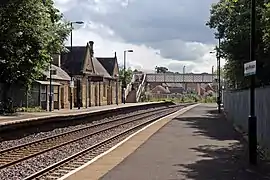 Ruabon station was originally larger than at present, with an extensive marshalling yard with a turntable and goods depot accompanying it, and was the terminus of the Ruabon to Barmouth line which ran via Llangollen, Corwen and Dolgellau.[2] This branch line was a victim of the Beeching cuts in the 1960s, closing to passengers in 1965 and completely three years later.[3] The bay platform serving this route can still be seen at the station, whilst the old goods yard has been redeveloped as a housing estate.