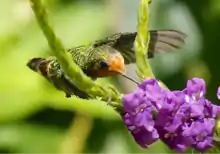 Coquette hummingbirds exhibit a distinctive vertical pumping of their tails when in flight. This pumping motion gives the birds an insect-like appearance, and often results in them being mistaken for sphinx moths, which share similar habitats and body sizes to the hummingbirds.[5]