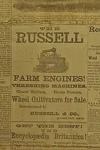 Russell & Company of Massillon, Ohio, are best known for manufacturing farm and railroad machinery in the late 19th and early 20th centuries. Most notably 18,000 Steam tractors and Stationary engines, plus 22,000 Threshing machines.[1][2][3]