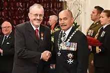 Bishop (left) in 2016, at his investiture as an Officer of the New Zealand Order of Merit, by the governor-general, Sir Jerry Mateparae