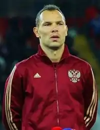 Russia were drawn in Group A with hosts Portugal, Spain, and Greece. They were not among the favourites to progress and tournament preparations were hampered by injuries to defenders Sergei Ignashevich and Viktor Onopko.[6] Russia started their tournament against Spain but a late goal from Juan Carlos Valerón put Russia on the brink of another group stage elimination.[7] Four days later, Russia became the first team eliminated after a 0–2 defeat to Portugal.[8] The final game of the group resulted in a surprising 2–1 victory over eventual champions Greece with Dmitri Kirichenko scoring one of the fastest goals of the tournament.[9]