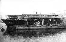 The Livadia was an imperial yacht of the House of Romanov built in 1879–1880 to replace a yacht of the same name that had sunk off the coast of Crimea in 1878. The new Livadia, intended for service on the Black Sea, was a radically novel ship conceived by Vice Admiral Andrey Popov, designed by naval architect Erast Gulyaev and built by John Elder & Co. of Govan on the Clyde. The Livadia continued Popov's line of circular ships although this time Popov sacrificed geometrical perfection for seagoing capabilities. She had a beam of 153 ft (47 m) against overall length of only 259 ft (79 m).[4] An extreme example of tumblehome architecture, she sported a conventionally shaped superstructure mounted on a wide, flat-bottomed, turbot-shaped submerged hull or pontoon.