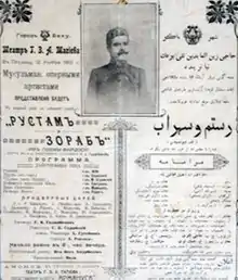 "Rustam and Zohrab" (in Azeri Rüstәm vә Söһrab) is the third mugham opera by Uzeyir Hajibeyov. It was composed in 1910 according to motifs of the poem "Shahnameh" by Ferdowsi, and written in Persian.[1][2]