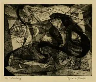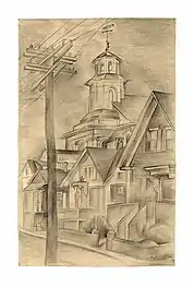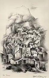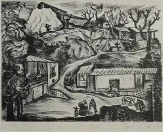 After turning from art instruction as her primary career, Ludins became a professional painter and printmaker. In 1928, she made a drawing of a street in Provincetown, Massachusetts, (shown above) which shows her ability at this early stage in her career as artist. A year later, she made a lithograph of Cassis, a town in southern France (shown above) which shows her skill as printmaker. In 1929, she showed oils in a group exhibition of forty artists at the Morton Galleries in Manhattan and a year later showed watercolors in a group exhibition at the Carnegie Institute in Pittsburgh.[17][18] Beginning in 1930, she participated in group shows of prints. That year, she had a print called "Cassis" selected in an exhibition sponsored by the American Institute of Graphic Arts. Called "Fifty Prints of the Year", the show was the fifth in an irregular series that extended from 1925 into the late 1930s.[19] A well-known artist, John Sloan, was responsible for selecting prints. In addition to "Cassis", he selected works by Stuart Davis, Morris Kantor, Raphael Soyer, Max Weber, and others.[20][21] Early in 1931, she showed block prints in a group exhibition at the Philadelphia Print Club and later that year she showed lithographs in another group at the Art Institute of Chicago.[22][23] In 1937, on her return from extensive travels in Mexico, she made an etching called "Mexican Village" (shown above) which shows her ability in that medium. In 1945, another etching, this one called "Bombing" (shown above), attracted attention.[5][24][25] It was shown that year in the 30th annual exhibition by the Society of American Etchers held at the National Academy of Design and also at the Willard Gallery in Manhattan and then, in 1947, at the Leicester Galleries in London.[5]